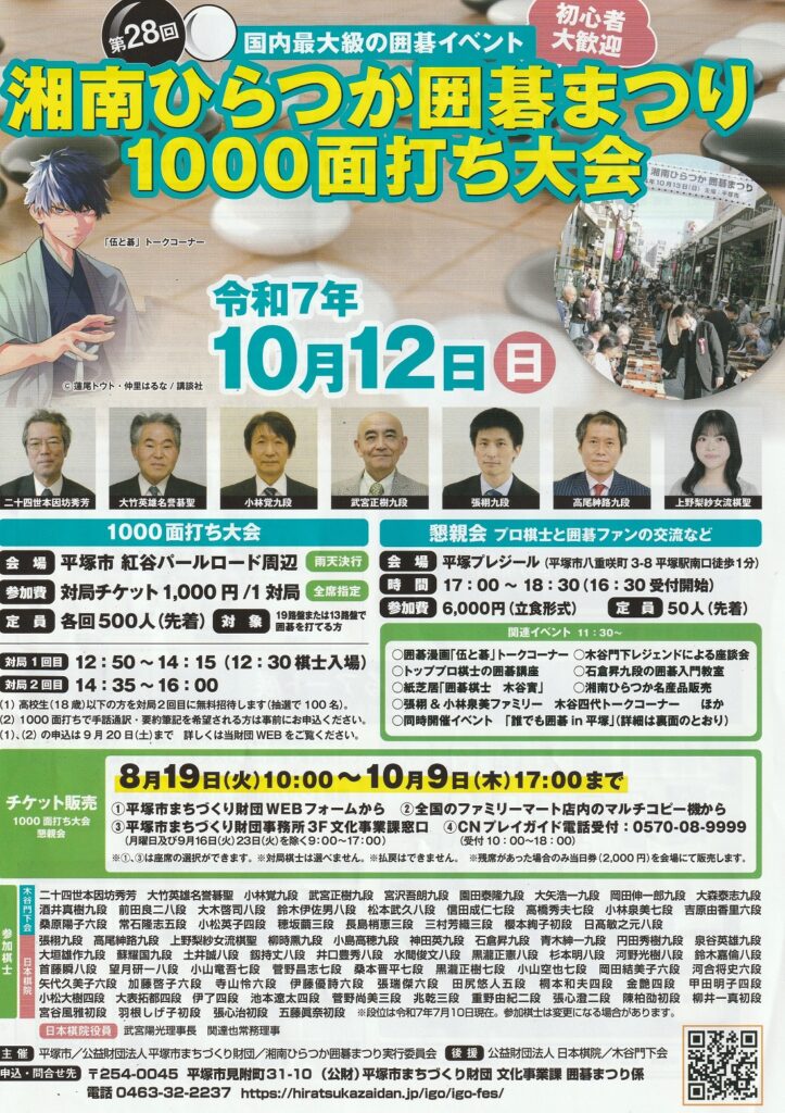 第28回湘南ひらつか囲碁まつり 2025年10月12日 smilekubo 第28回湘南ひらつか囲碁まつりが令和7年(2025年)10月12日(日)に開催されました。 このイベントは、平塚市桃浜町の自宅に囲碁道場を開き、多くのプロ棋士を育てた木谷實(きたにみのる)九段の功績をたたえ、囲碁文化の普及・振興を目的として開催されています。囲碁のプロ棋士と対戦できる1000面打ち大会を中心に各種イベントが開催されました。 ▲詳細はこちら 投稿ナビゲーション 前の記事第73回湘南ひらつか七夕まつり次の記事ひらつかシーテラス・オープン